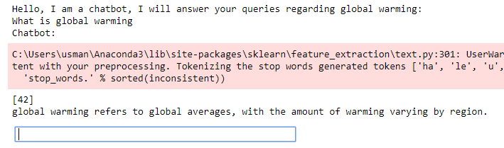 From the output, you could see that I entered the question: “What is global warming” and I received a very good response from the chatbot. You can ignore the warning. It is appearing because the stop words from NLTK doesn’t contain words like “ha”, “le”, “u” etc.