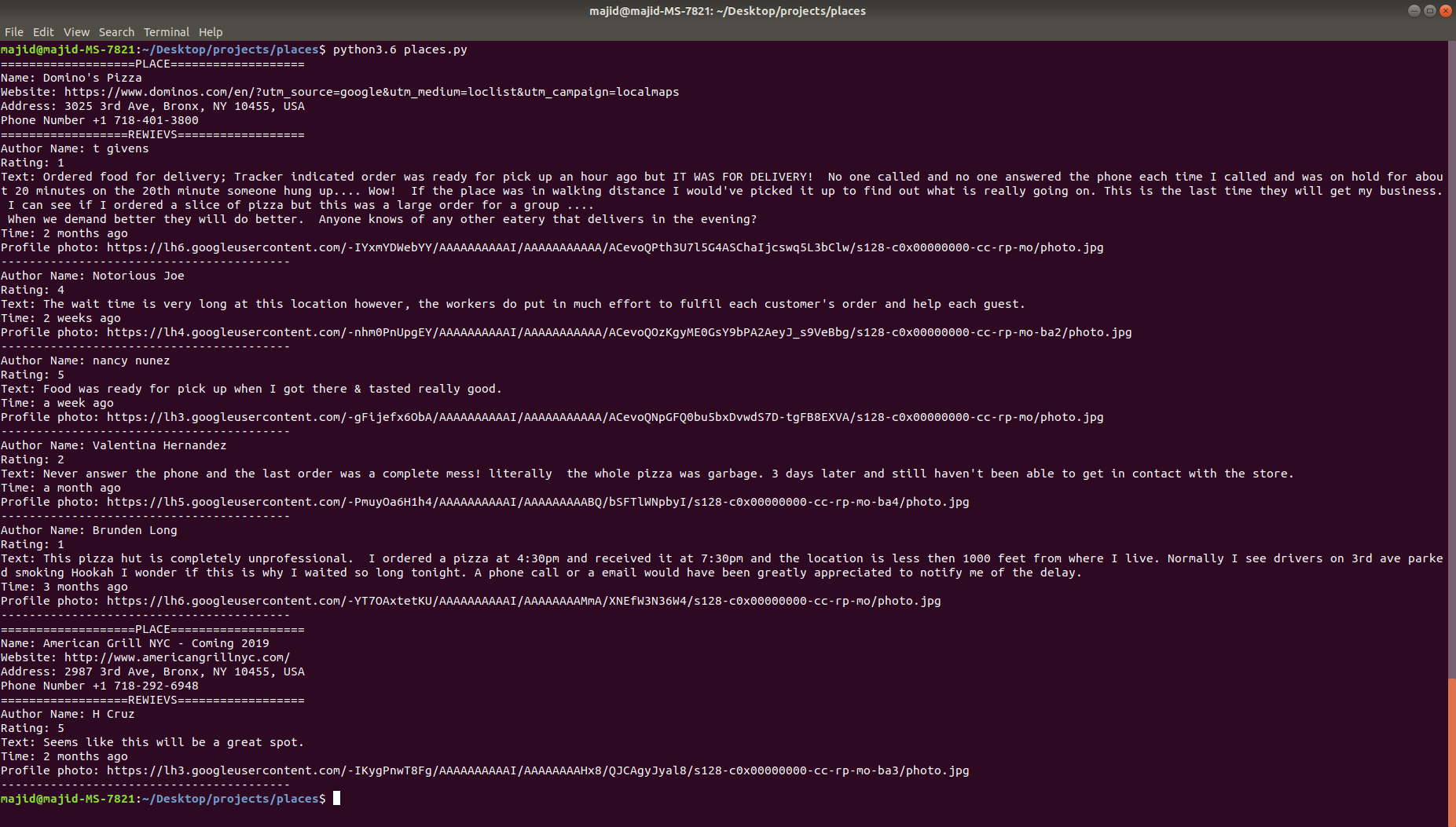 for place in places: details = api.get_place_details(place['place_id'], fields) try: website = details['result']['website'] except KeyError: website = "" try: name = details['result']['name'] except KeyError: name = "" try: address = details['result']['formatted_address'] except KeyError: address = "" try: phone_number = details['result']['international_phone_number'] except KeyError: phone_number = "" try: reviews = details['result']['reviews'] except KeyError: reviews = [] print("===================PLACE===================") print("Name:", name) print("Website:", website) print("Address:", address) print("Phone Number", phone_number) print("==================REVIEWS==================") for review in reviews: author_name = review['author_name'] rating = review['rating'] text = review['text'] time = review['relative_time_description'] profile_photo = review['profile_photo_url'] print("Author Name:", author_name) print("Rating:", rating) print("Text:", text) print("Time:", time) print("Profile photo:", profile_photo) print("-----------------------------------------") |