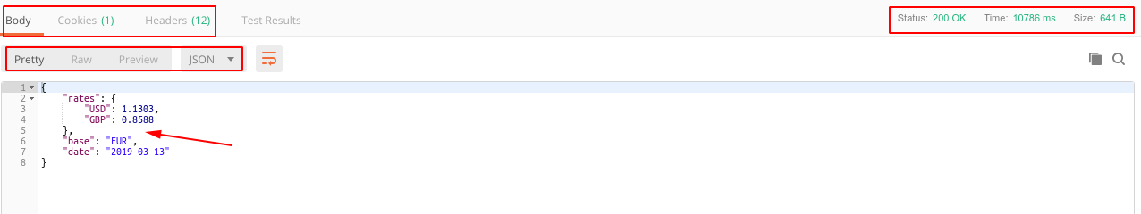 To the left, you get to see even more details. By clicking through the tabs, you can view extra information about the response such as the cookies and headers returned. Below that you can select the different display formats of the data returned.
