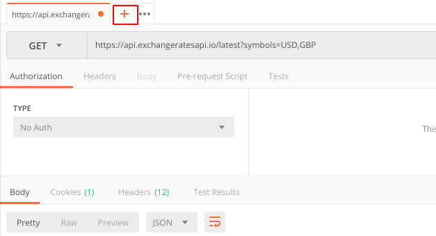 Now you are going to make another GET request. This time however, you are going to get all exchange rates with the USD as the base currency. Click the + icon at the top to open a new tab.