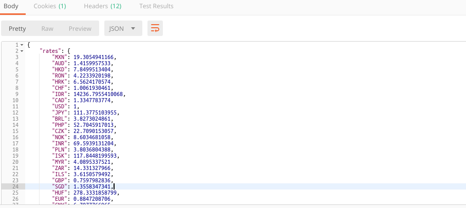 You should end up with a response containing the exchange rates of all the currencies in relation to the USD.